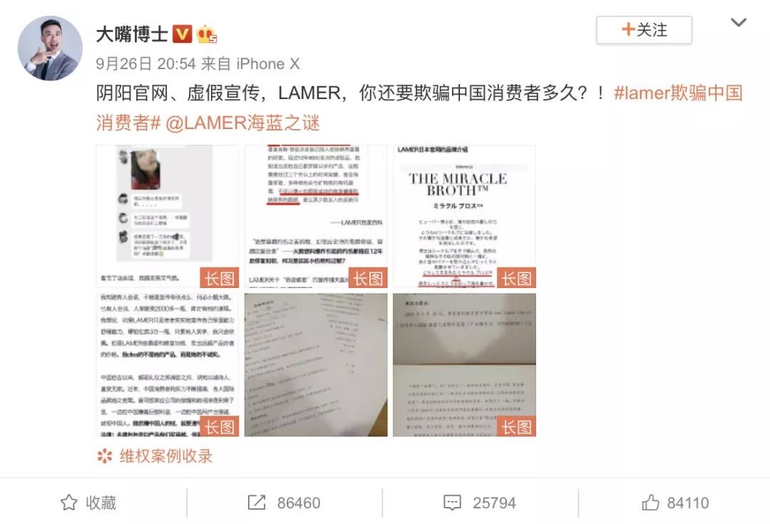 9月26日,美妆博主@大嘴博士 在微博上称已对雅诗兰黛旗下品牌La Mer(海蓝之谜)提起诉讼,原因是其虚假宣传并不存在的修复疤痕功效。