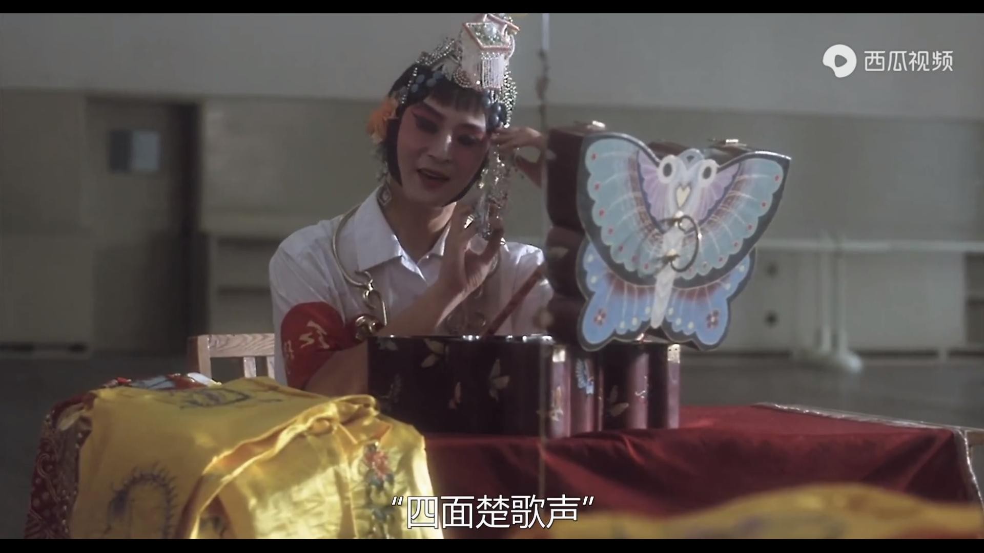 当小四满怀欣喜地打开师傅的首饰匣,扮成虞姬的样子,唱着《霸王别姬》,还没唱几句,就被红卫兵发现……戏中的唱词“四面楚歌”,讽刺般地影射着小四的结局。