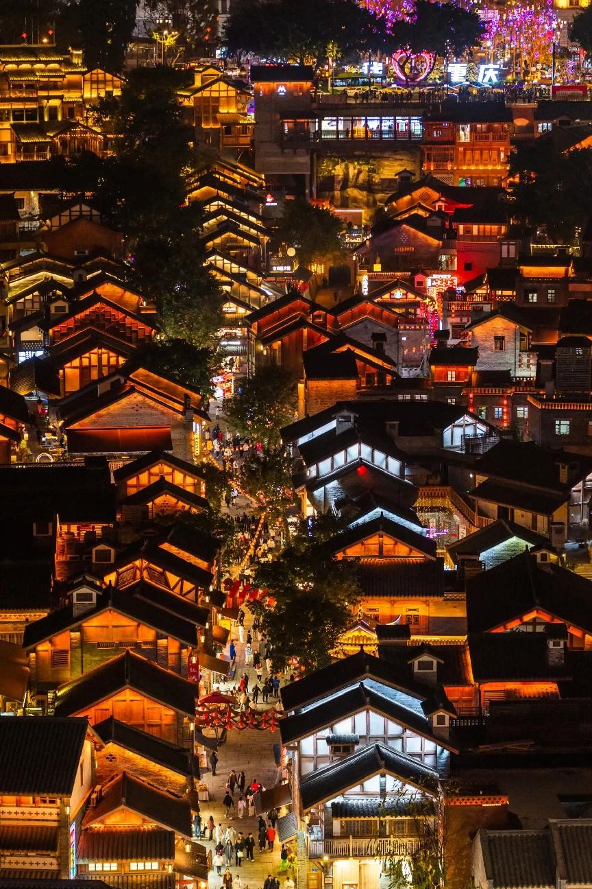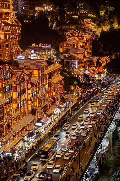 层层叠叠的洪崖洞夜景。依山而建的空中步道。江景与山城的完美融合。