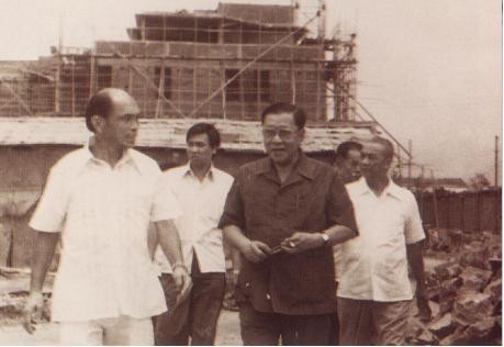 上世纪70年代末,改革开放春风吹遍神州大地。广大旅外乡贤桑梓情深,纷纷回来支持家乡经济建设。在广东番禺县委县政府的高度重视与支持下,番禺乡贤何贤、霍英东、张耀宗和梁昌哲嗣等港澳知名人士为家乡出谋划策,仗义捐资兴建番禺宾馆。图为何贤先生(前排右一)、霍英东先生(前排左一)在番禺县领导陪同下视察番禺宾馆建设工地。