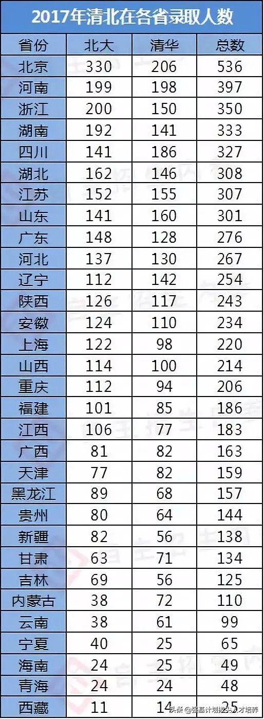 据统计:2017年清华北大共录取6558人,而高考总报名人数为923万,录取率仅为0.07%,也就是平均1万人中录取7个。而分配到各个省,录取率可能要远低于平均水平。