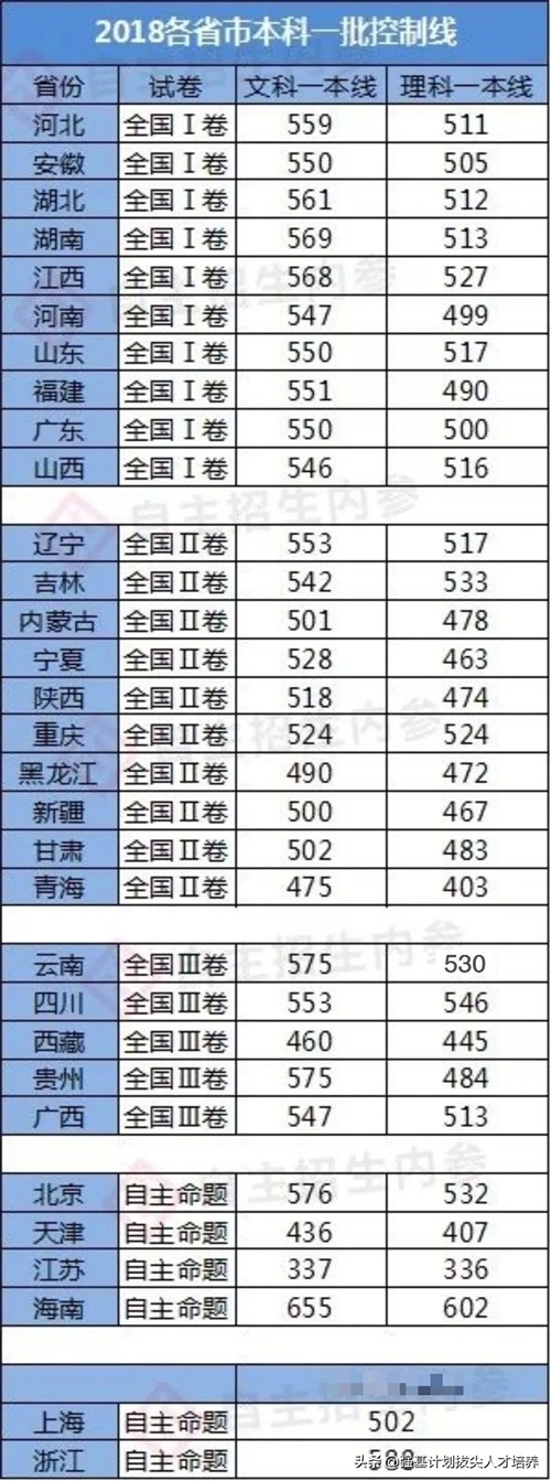 2018年各省市的本科一批控制线基本都已经公布,使用全国Ⅰ卷的省市文科一本线集中在546—569之间,最高的为湖南569分,最低的为山西546分;理科分数线集中在490—527之间,最高的为江西527分,最低为福建490分;