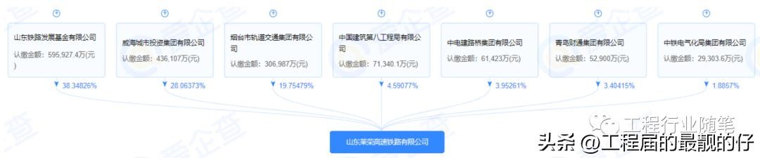山东莱荣高速铁路有限公司:公开信息和企业年报显示,山东莱荣高速铁路有限公司2021年1月29日成立,注册资本 1553988万元,主要负责莱西至荣成铁路的建设及运输管理工作。公司秉承“创新、奉献、高效、和谐”的企业理念,按照“股权多元化”的方式积极引入战略投资者参与高铁建设。股东分别为山东铁路发展基金有限公司(占股比38.34826%)、威海城市投资集团有限公司(占股比28.06373%)、烟台市轨道交通集团有限公司(占股比19.75479%)、中建八局(占股比4.59077%)、中电建路桥集团有限公司(占股比3.95261%)、青岛财通集团有限公司(占股比3.40415%)、中铁电气化局集团有限公司(占股比1.8857%)。