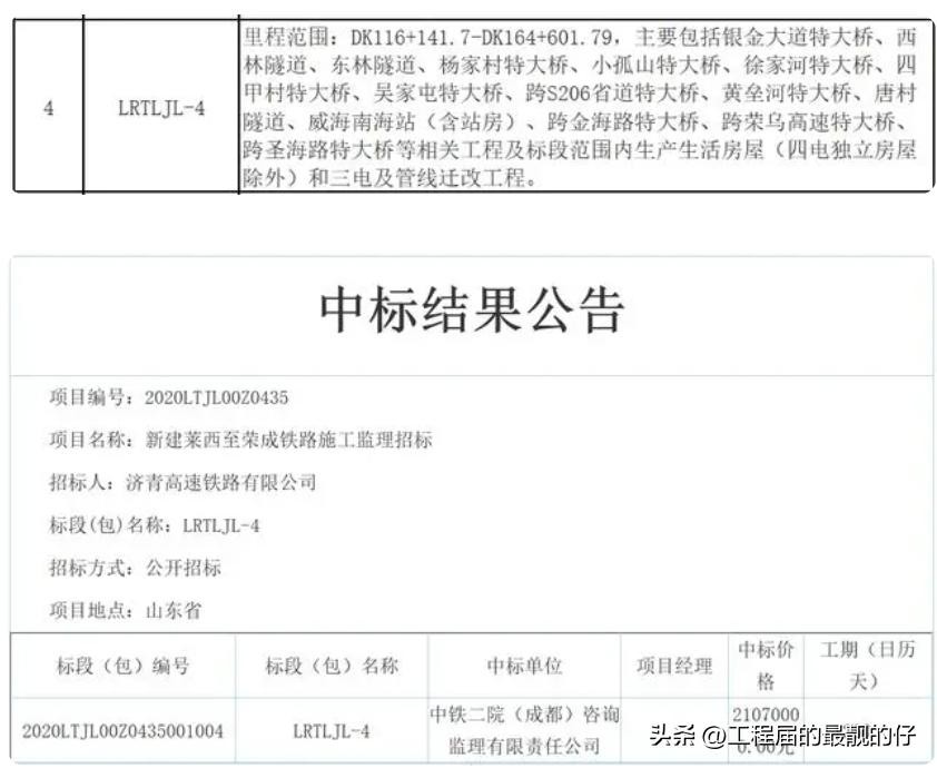 中铁二院:根据济南公共资源交易中心在2020年10月发布的公告,中建八局施工标段对应的是LRTLJL-4监理标段,里程范围同样为DK116+141.7-DK164+601.79。中铁二院(成都)咨询监理有限责任公司(简称中铁二院监理公司)中标“新建莱西至荣成铁路站前工程施工总价承包LRTLSG-3标段”,中标金额2107万元。