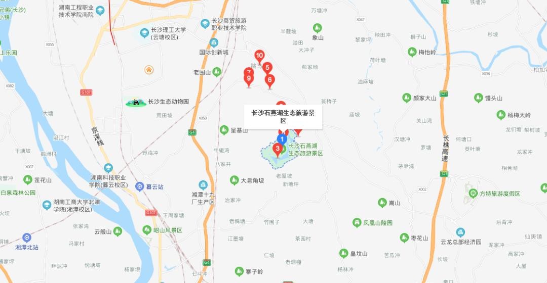 石燕湖公园处于长株潭三地交界处,长沙市雨花区跳马镇。景区占地面积10平方公里,距长沙生态动物园16公里左右,距万家丽南路长沙总部基地11公里左右。