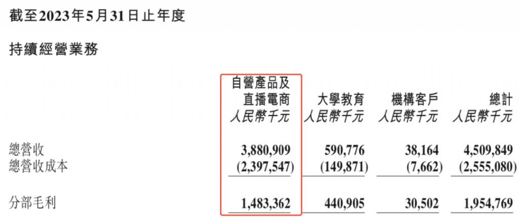 结合东方甄选最新财务数据来看,2023 财年(2022 年 6 月 1 日 -2023 年 5 月 31 日)东方甄选自营产品及直播电商业务的总营收 39 亿元,其中自营产品总营收超过 26 亿元,毛利 15 亿元。