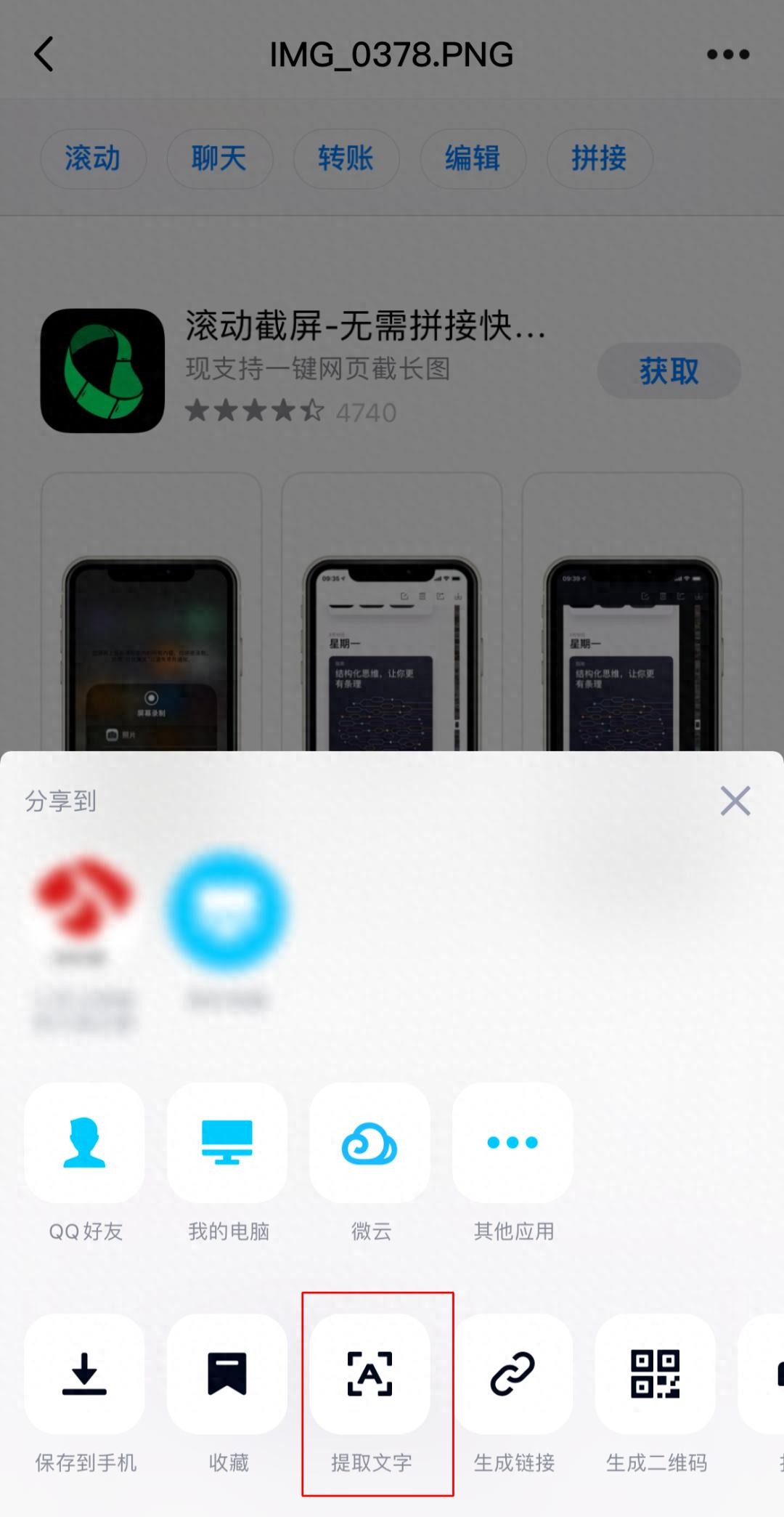 2、长按对话中的图片,最后在弹出框中选择「提取图中文字」即可。