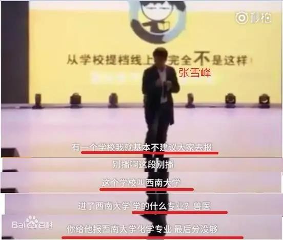 随后他在一段演讲中,号召大家不要报考西南大学的视频也被扒出,因为调侃西南大学的兽医专业引发争议,虽然后来张雪峰也在微博中向西南大学的师生作出了道歉,但西南大学的工作人员还是表示,不会因为他发表了道歉信就原谅他。