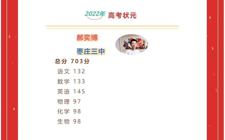 郝奕博,男,毕业于枣庄三中,高考总分703分,2022年山东省高考状元,被清华大学录取。