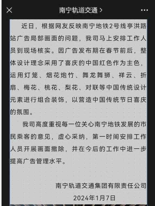 根据澎湃新闻报道,近日有网友反映,南宁地铁通道现 " 日本军旗 " 广告。随后,南宁轨道交通集团有限公司则于 7 日发布说明,称广告采用中国传统设计元素进行组合装饰,以营造节日喜庆氛围。地铁的客服人员也表示,绝不会是日本军旗,可能是 " 画得像 "。