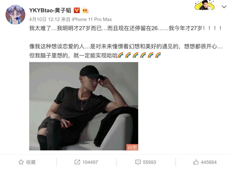 4月10日,黄子韬表示:“我太难了……我明明才27岁而已……像我这种想谈恋爱的人……是对未来憧憬着幻想和美好的遇见的,想想都很开心……但我脑子里想的,就一定能实现哈哈!”
