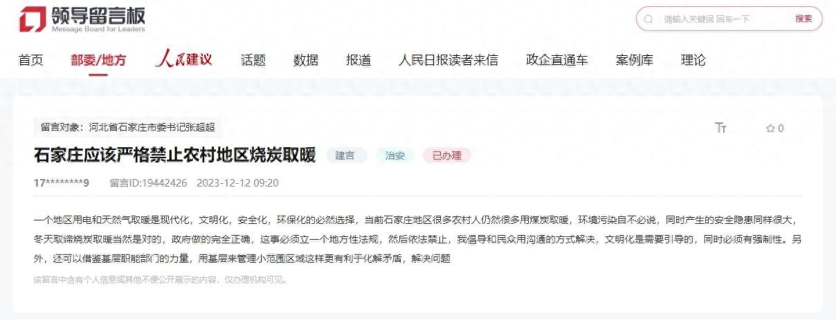 网友提议石家庄禁止农村地区烧炭取暖 官方回应“已转交相关部门”