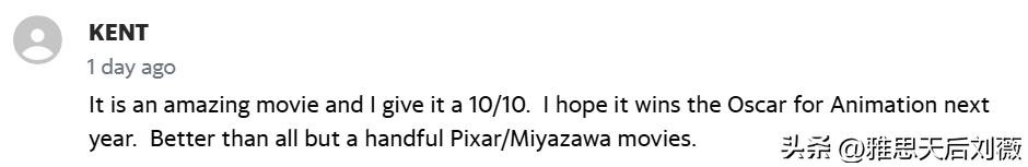 这是一部很棒的电影,我给它10/10的评价。我希望它明年能获得奥斯卡动画奖。甚至比皮克斯/宫崎骏的几部电影都要好。