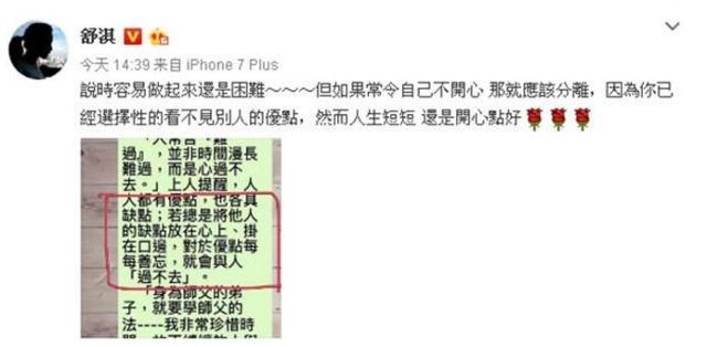 后来她又在微博上写道:“说时容易做起来还是困难,但如果常令自己不开心,那就应该分离,因为你已经选择性的看不见别人的优点,然而人生短短,还是应该开心点好。”