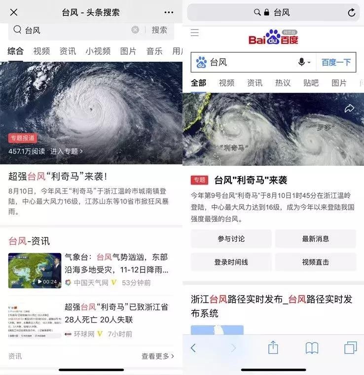 同样在百度搜索中输入“台风”等关键词,结果有来自百家号、百度智能小程序的内容,同时还有微博、虎扑、腾讯视频等站外源。