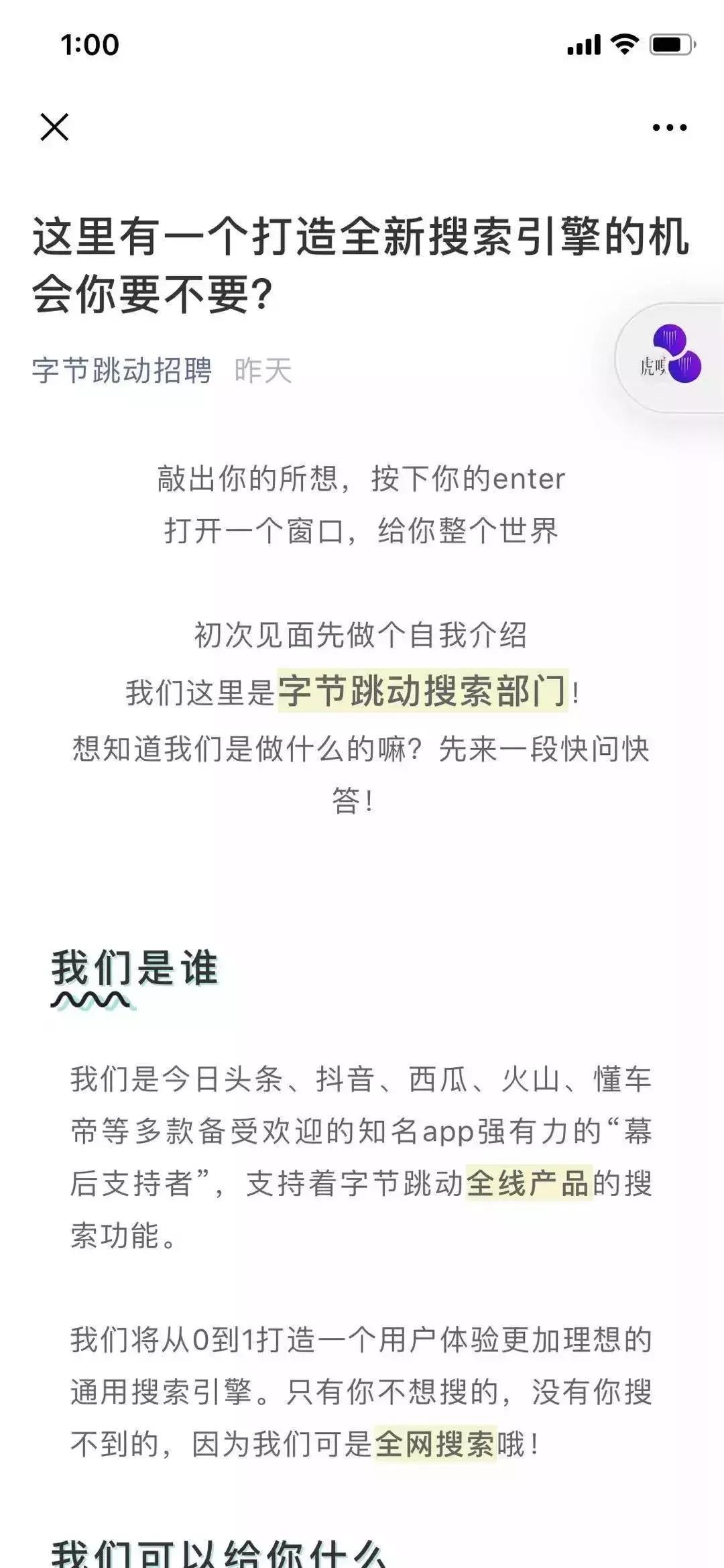 上周,字节跳动招聘官方发布了招聘启事,而这则招聘广告,完全显露了字节跳动对搜索领域的野心。招聘中称,字节跳动已建立搜索部门,将打造一个通用搜索引擎,支持全网搜索。