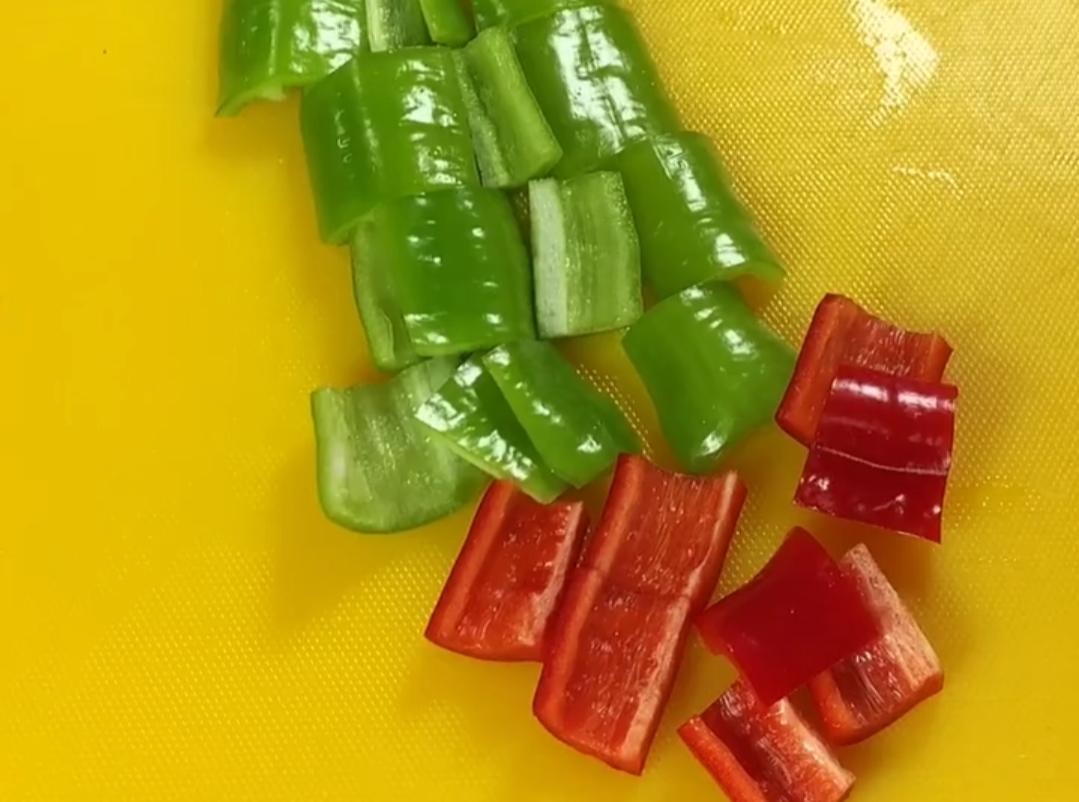 青红尖椒切成段儿备用。