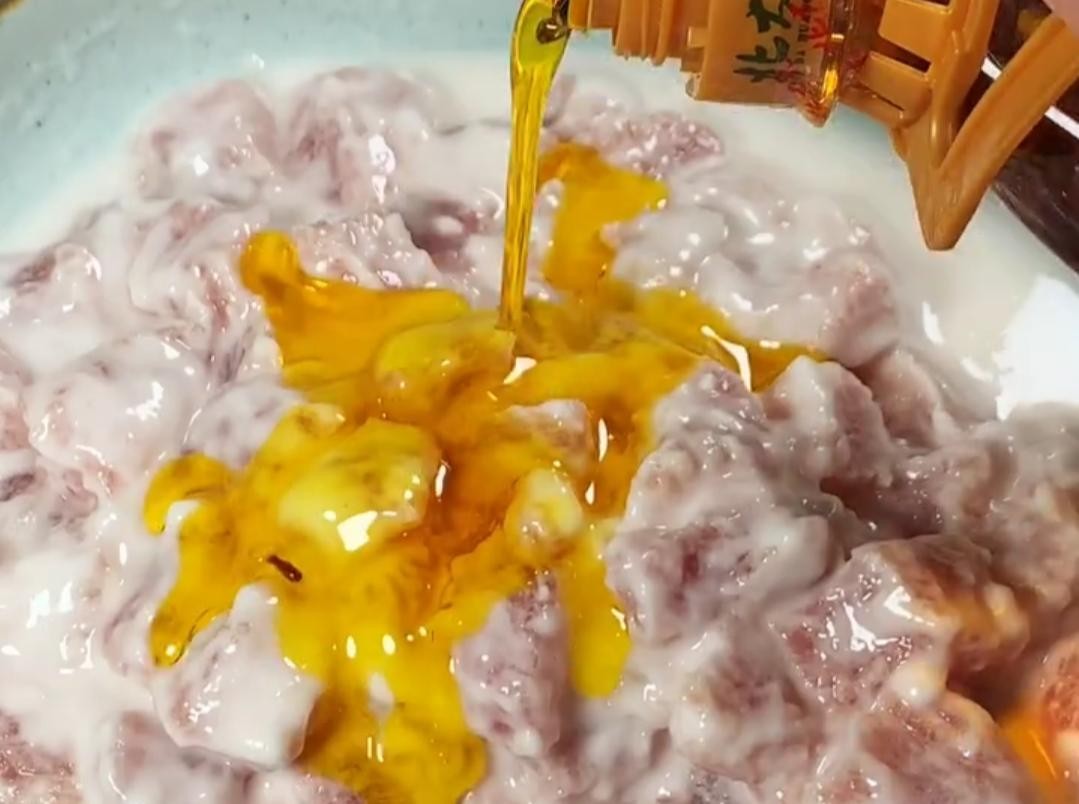 然后加入少许盐,胡椒粉抓拌均匀,腌一分钟。再加两勺玉米淀粉,半勺清水,抓至成酸奶糊,再来点儿豆油,这样防止它炸的时候不崩。