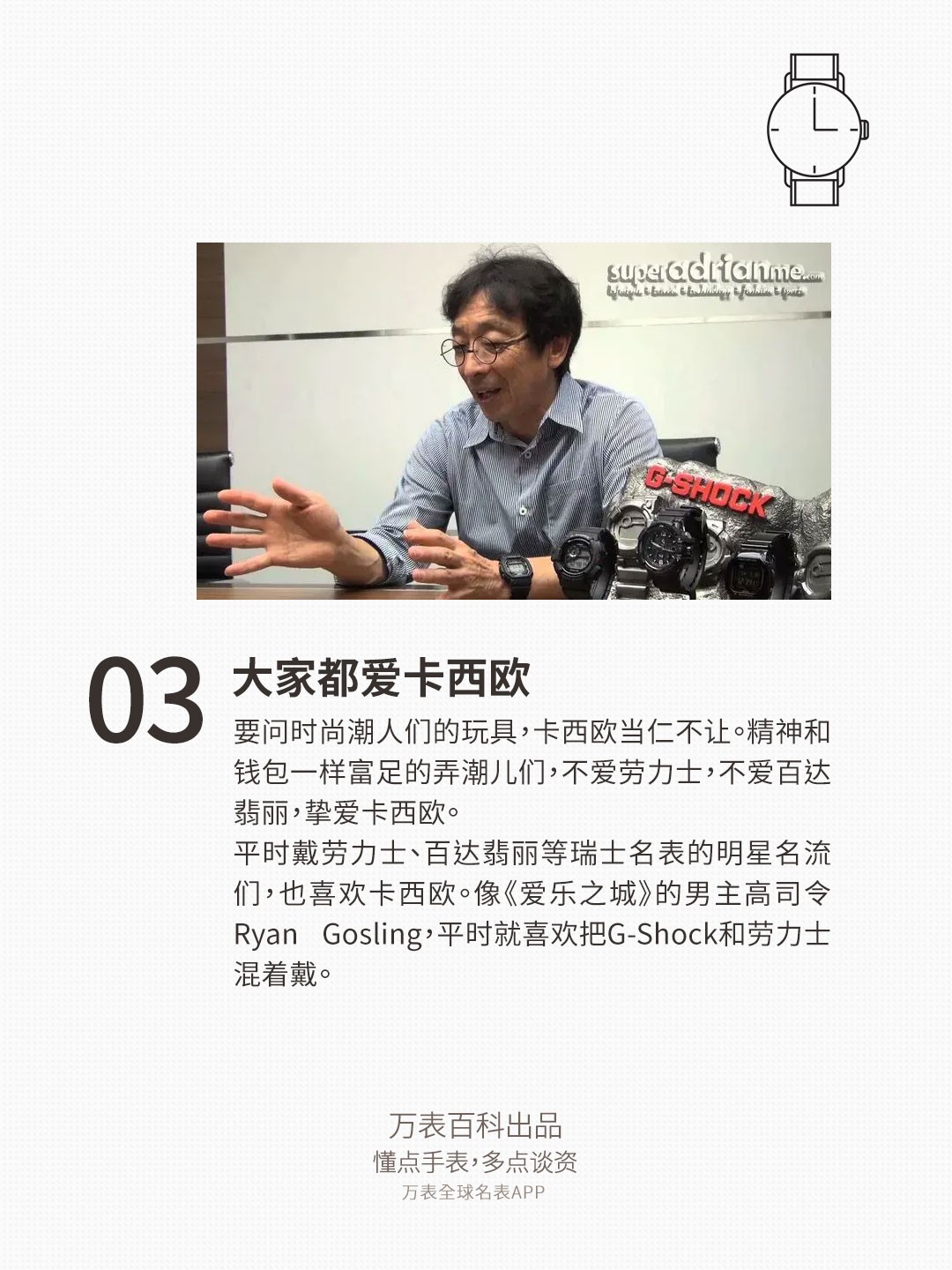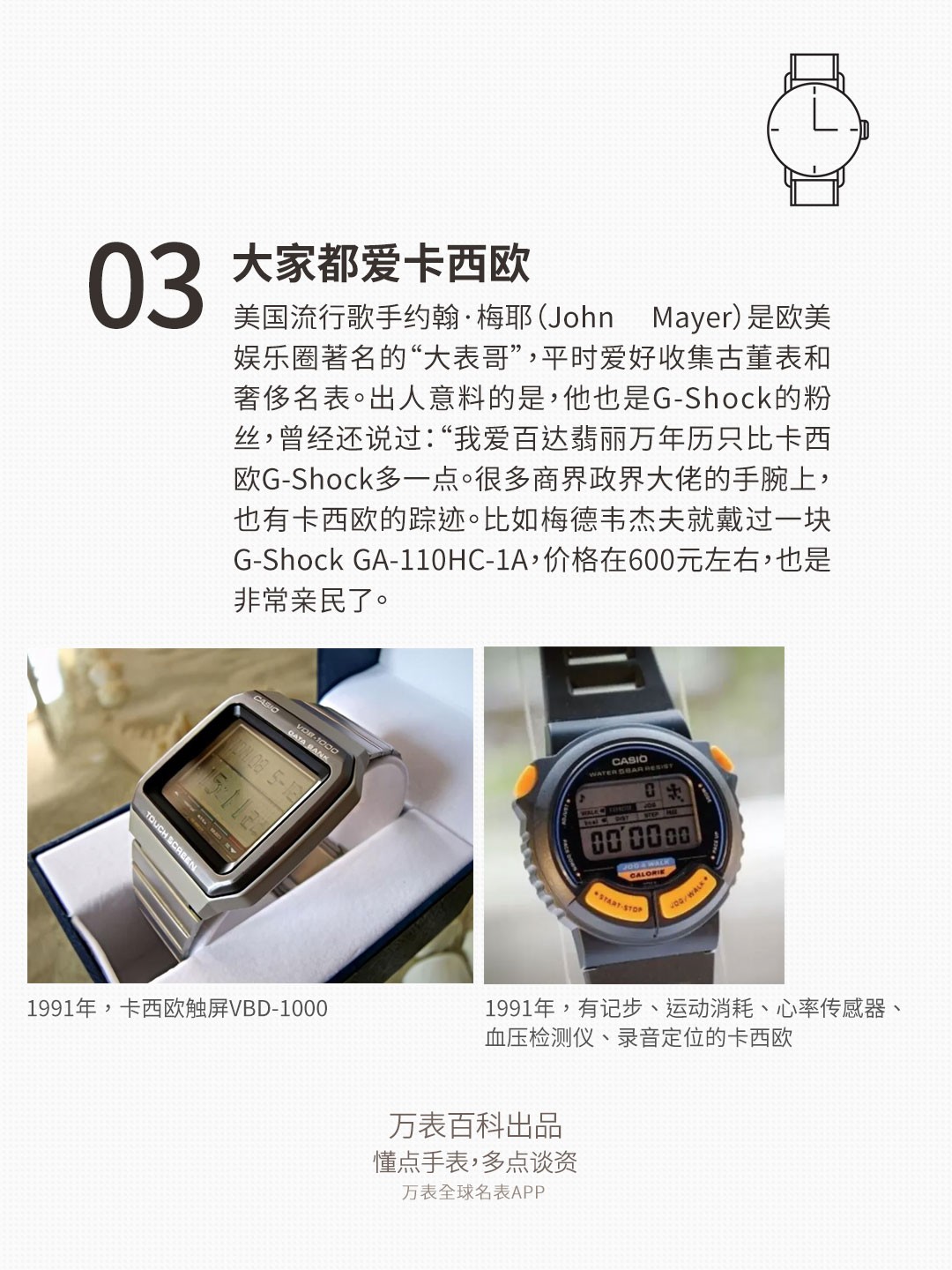 平时戴劳力士、百达翡丽等瑞士名表的明星名流们,也喜欢卡西欧。像《爱乐之城》的男主高司令、美国流行歌手约翰·梅耶是欧美娱乐圈著名的“大表哥”。很多商界政界大佬的手腕上,也有卡西欧的踪迹。