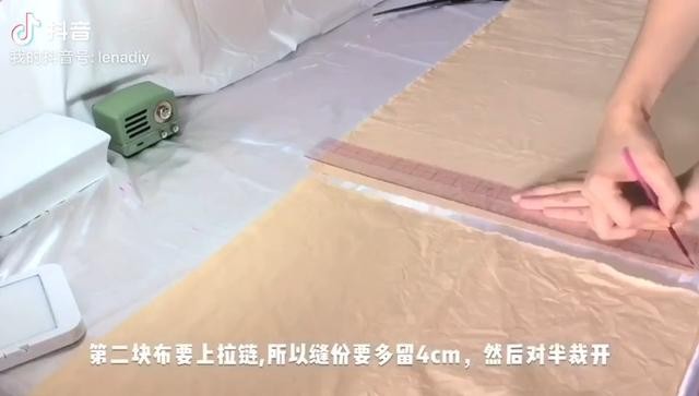 第二块布要上拉链,所以封份要多留4CM,然后对半裁开,这里要注意,因为我这个教程是有花边的,所以我裁剪的布料是三块,两大一小。如果是做没有花边的抱枕,那就只要裁成两块一样大小的布料就可以了。