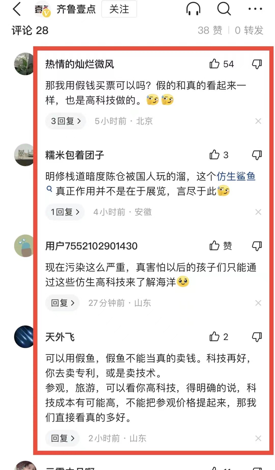 此事引发了网友的广泛讨论。许多人表示,他们可以理解为了节省成本而使用模型或仿制品,但至少在宣传时应明确告知游客。也有人认为,花近300元看假鲨鱼,是对游客权益的严重侵犯。