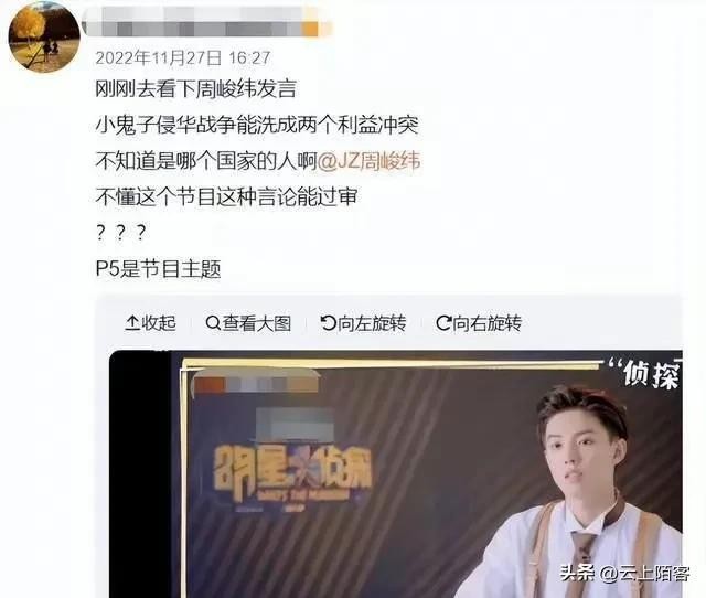 有网友扒出之前周峻纬参加某档节目,回答对待日本侵华战争的态度,疑似存在立场问题。