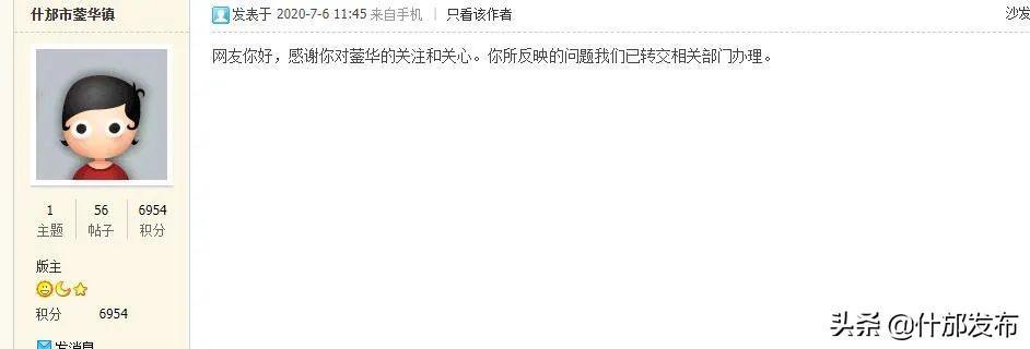 收到群众留言后“什邡发布”通过“什邡政务论坛”将该情况反映给蓥华镇