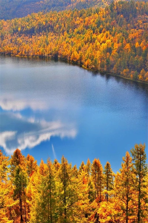这里秋天更是美极一时,山林草木的层林尽染,云霞婀娜多姿洒在天边,蓝天白云又轻轻地躺在了碧水里,大美至此!