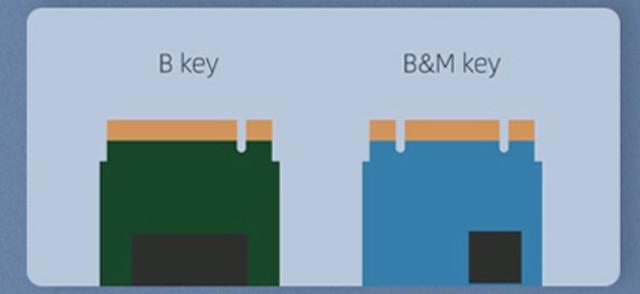 除此之外,有些笔记本虽然配备的是 M.2 插槽,但是内部结构有区别,如下图所示,B key 就是 NVMe 协议,固态硬盘的金手指只有一个缺口,而 B&M Key 则有两个缺口,这个产品就是 SATA 协议的,千万不要买错了。