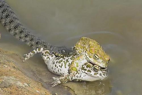 大家都知道蛇是吃青蛙的,当然了,蟾蜍也是蛙类,当然逃不出蛇的食谱里,就算是这样,在繁殖季节里,也曾有人见到过,在小溪边一只蟾蜍死死的抱着一条不大的蛇,两只脚都抠进了蛇的眼睛里,那蛇只是软软的摊上溪边上,无力的甩着尾巴。
