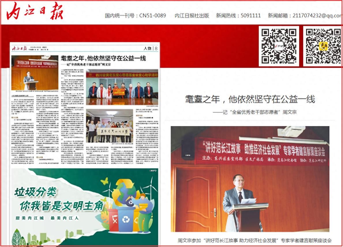 周文宗曾是中共四川内江市东兴区委宣传部副部长、东兴区文明办主任,2024年3月,他被中共四川省委老干部局表彰为“全省优秀老干部志愿者”。这份荣誉,是对他多年来坚持公益的肯定,更是激励他继续前行的动力。