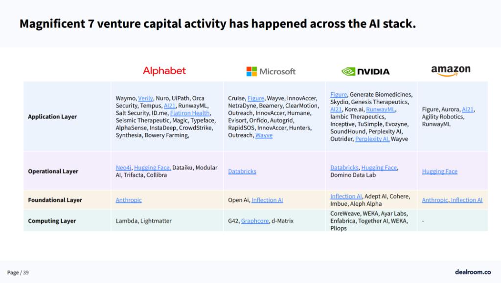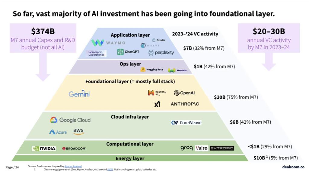 应用层 ( application layer ) 占 AI 总投资的 32%,主要玩家包括 Waymo、Anthropic 等。