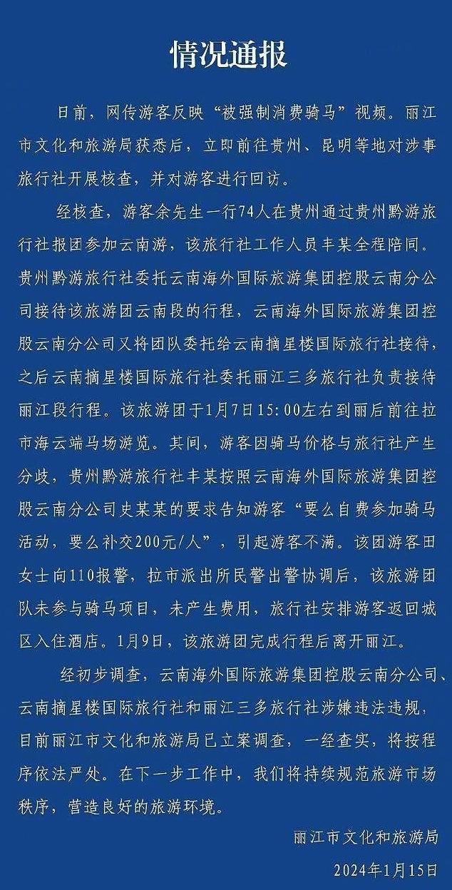 74人旅游团被强制要求消费骑马?丽江文旅局回应