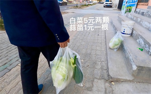 看着他们手上拎着大白菜和蒜苗,大叔说大白菜5元2颗,很便宜,蒜苗1元一根,就有点贵。