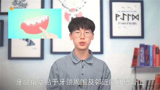 牙龈指紧贴于牙颈周围及邻近的牙槽骨上淡红色的结构,由复层扁平上皮及固有层组成。是口腔黏膜的一部分,血管丰富,呈淡红色,坚韧而有弹性,因缺乏黏膜下层,直接与骨膜紧密相连,故牙龈不能移动。老年人的牙龈常萎缩,牙颈外露。