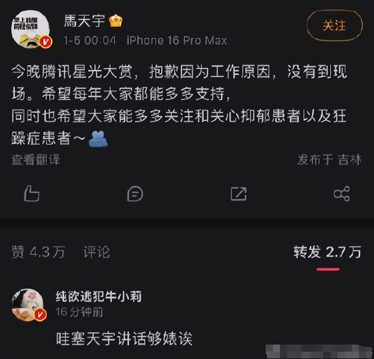 三来,马天宇的发文,让很多抑郁症和狂躁症患者感觉到被冒犯。