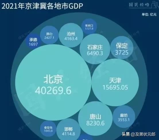 根据统计数据,2022年京津冀地区生产总值合计10.0万亿元,北京、河北跨越4万亿元量级,均为4.2万亿元;天津1.6万亿元。唐山GDP只有8900亿,比天津的二分之一稍多,只有北京的五分之一不到。