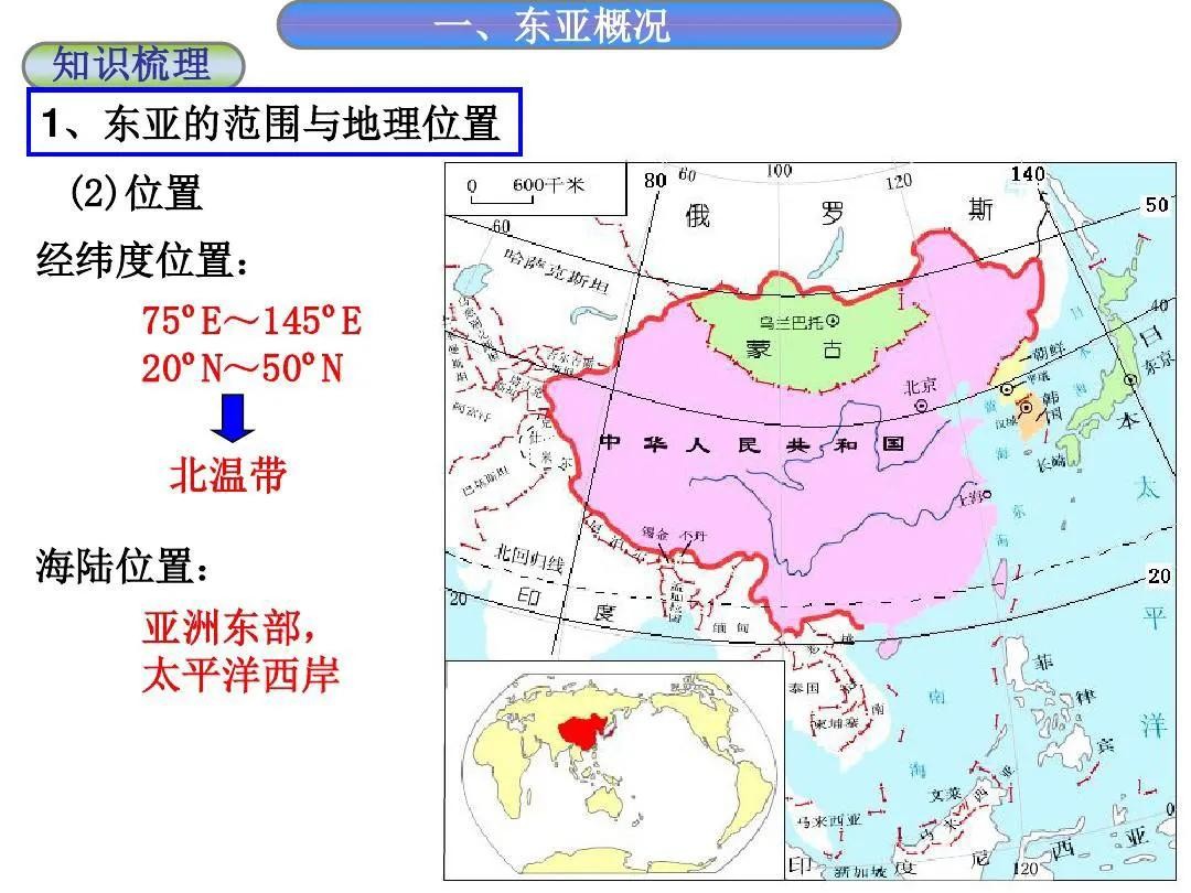 东亚位于世界最大大陆—亚欧大陆的东部,位于世界最大大洋—太平洋的西部。