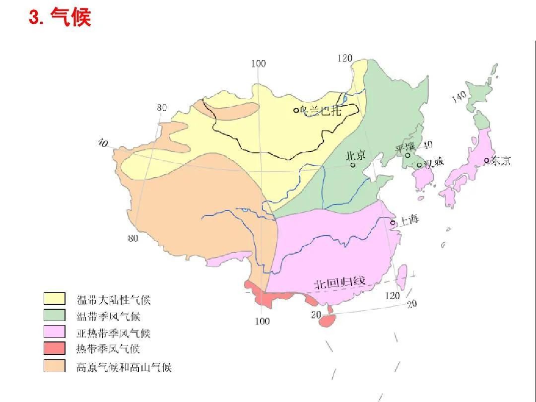 东亚地形复杂,海岸线曲折,地势大致呈西高东低的走向;气候以亚热带和温带季风气候为主,夏季雨热同期,冬季相对温和湿润,夏季受台风影响比较大。