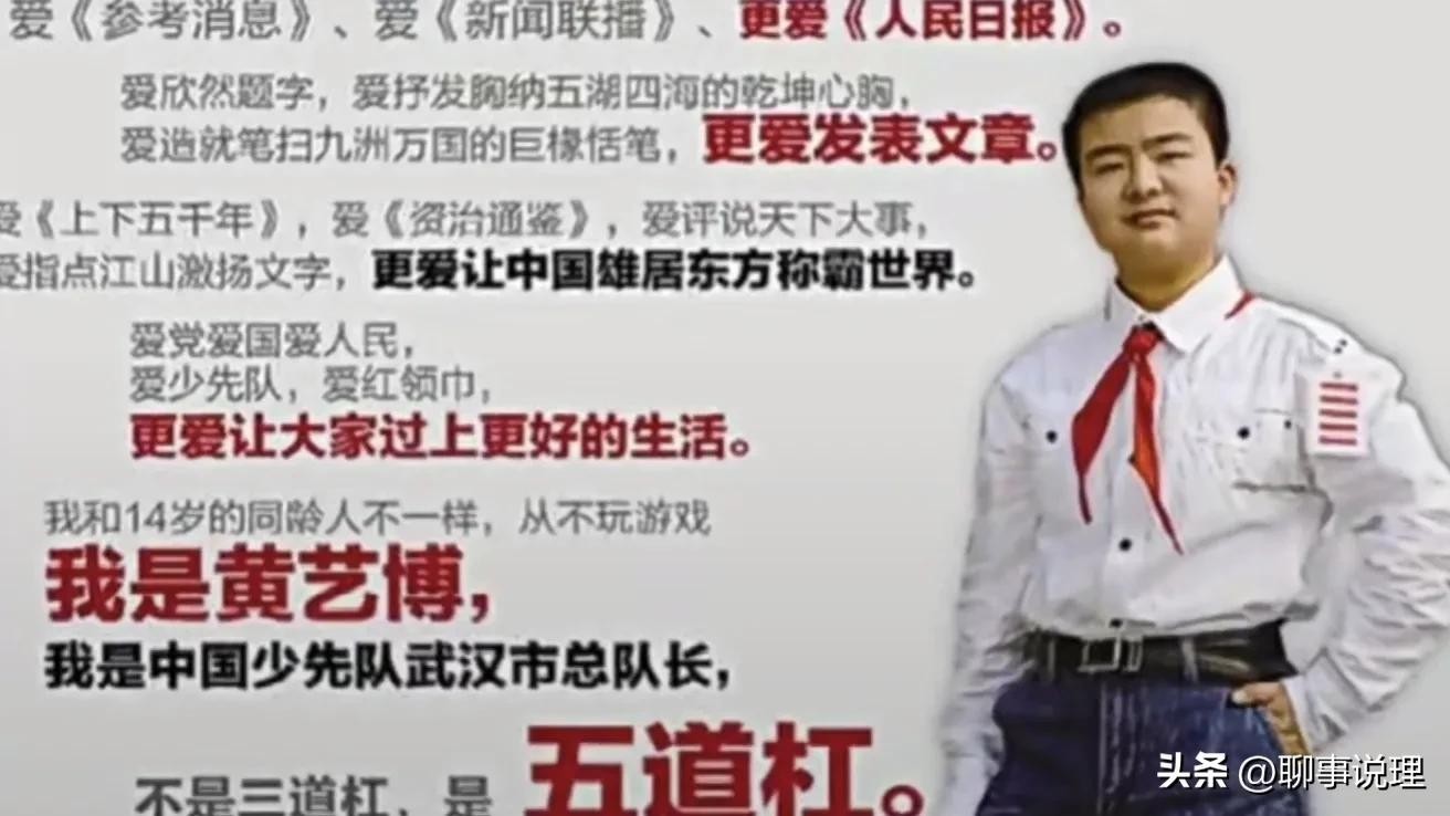 “五道杠少年”原名黄艺博,1998年出生,13岁以前就获得过“全国百名优秀好少年”、“全国五星雏鹰奖章”、“湖北省优秀少年”等无数荣誉,并担任湖北省少先队“五道杠”副总队长。