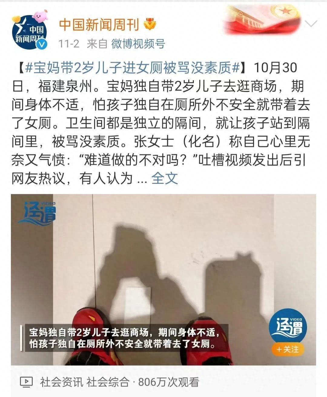 一位宝妈独自带着2岁孩子上厕所,期间身体不适,因为不放心把孩子一人放在外面,就把他带进了卫生间的单独隔间里。