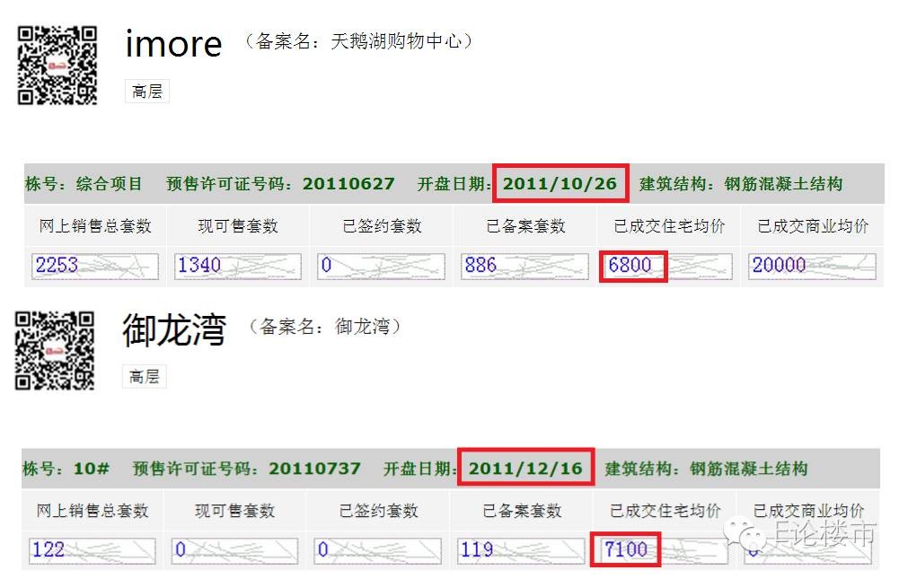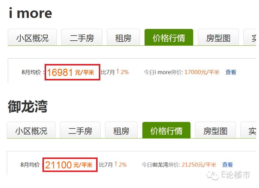 我们可以看到Imore在2011年10月26日开盘,均价为6800元;御龙湾的10栋于2011年12月16日开盘,比Imore晚了50多天,均价7100元,价位相近。