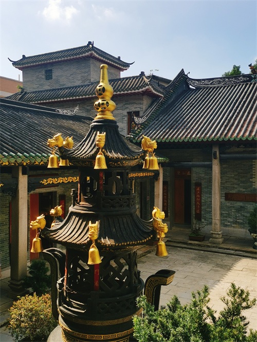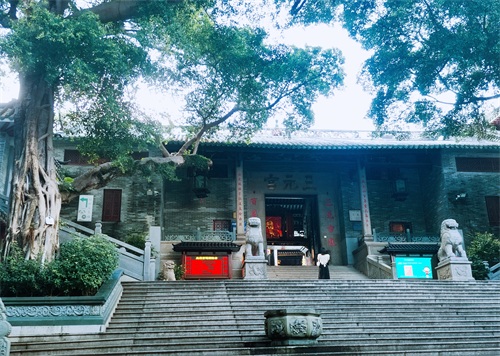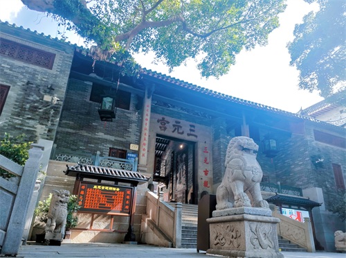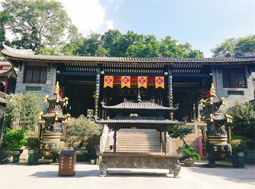 广州三元宫是岭南地区历史最悠久的道教宫观,位于越秀山南麓,坐北朝南,占地约5100平方米。三元宫原名越冈院,始建于公元319年,距今已有1700年历史了,是东晋南海郡太守鲍靓为其女鲍姑在此修道行医而建。后人为纪念鲍姑,在此立像祀奉,称鲍姑祠。明朝万历年间重修,崇祯年间扩建大殿,改祀三元大帝,更名三元宫。改鲍姑祠为配殿,并设有老君殿、吕祖殿、玉皇殿、、财神殿、观音殿、钟楼、鼓楼、客堂、斋堂、祖堂、钵堂等建筑,三元宫规模宏伟,殿宇巍峨。宫内终年香客游人络绎不绝,四季花草飘香,香火旺盛。