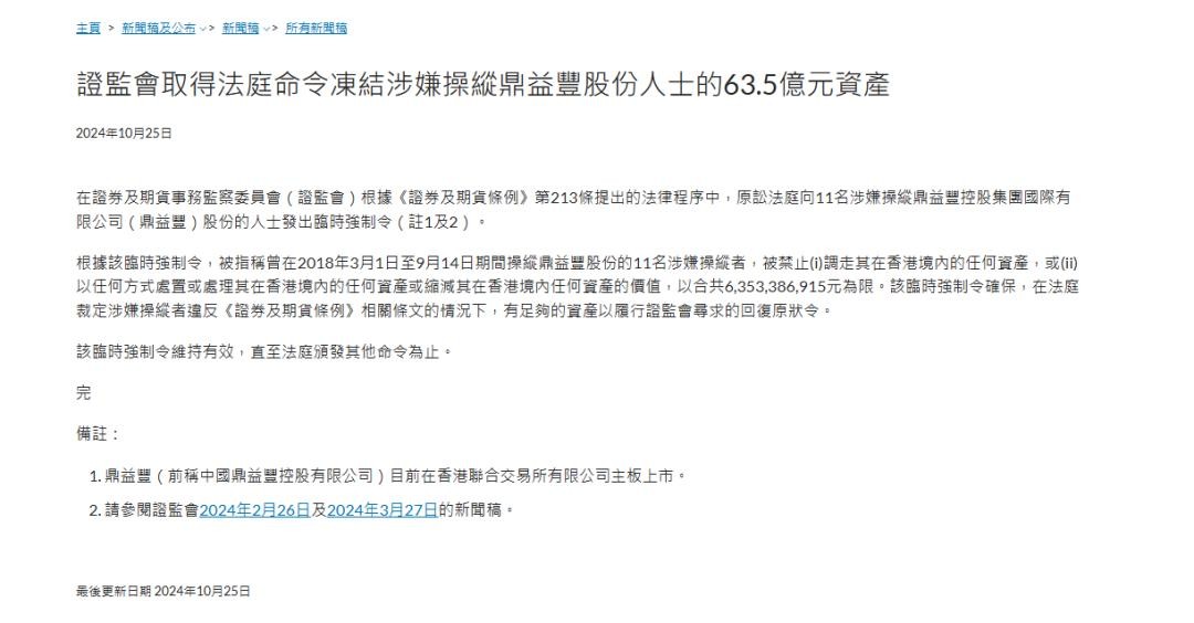 今年10月25日,香港证监会曾公告称,原讼法庭向11名涉嫌操纵鼎益丰控股集团国际有限公司(鼎益丰)股份的人士发出临时强制令。根据该临时强制令,被指称曾在2018年3月1日至9月14日期间操纵鼎益丰股份的11名涉嫌操纵者,被禁止调走其在香港境内的任何资产,或以任何方式处置、或处理其在香港境内的任何资产、或缩减其在香港境内任何资产的价值,以合共63.53亿港元为限。