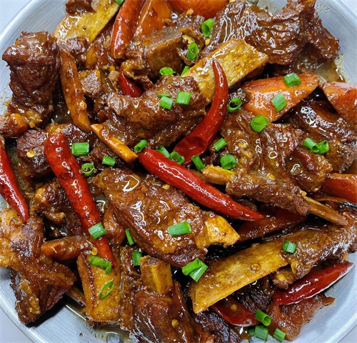 3、加入开水没过羊排,大火煮三分钟后转小火焖煮50分钟。然后放入胡萝卜再焖煮10分钟,直至胡萝卜煮软。最后加入洋葱和辣椒,少许老抽上色,翻炒收汁三分钟左右,即可出锅享用。