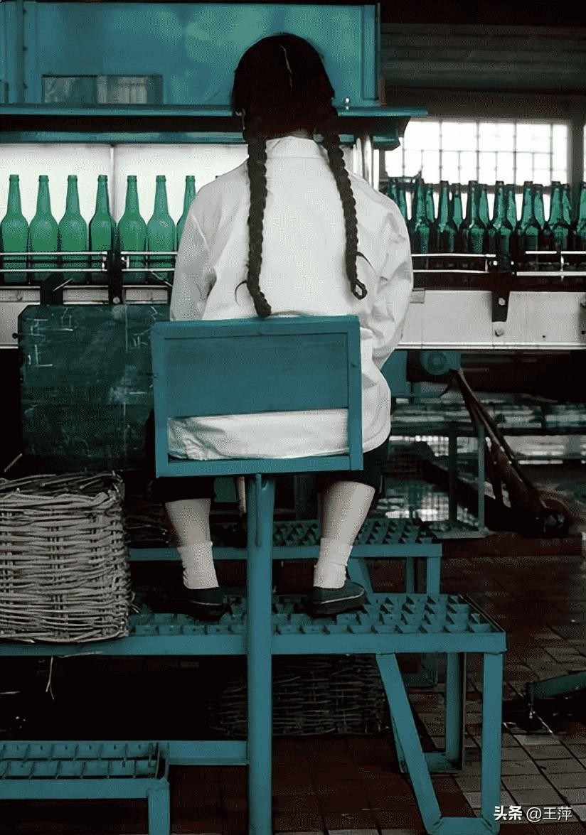 1979年的青岛,在青岛啤酒的生产车间内,一位女工坐在高凳上,面对着传送带上滚滚而来的绿色啤酒瓶。