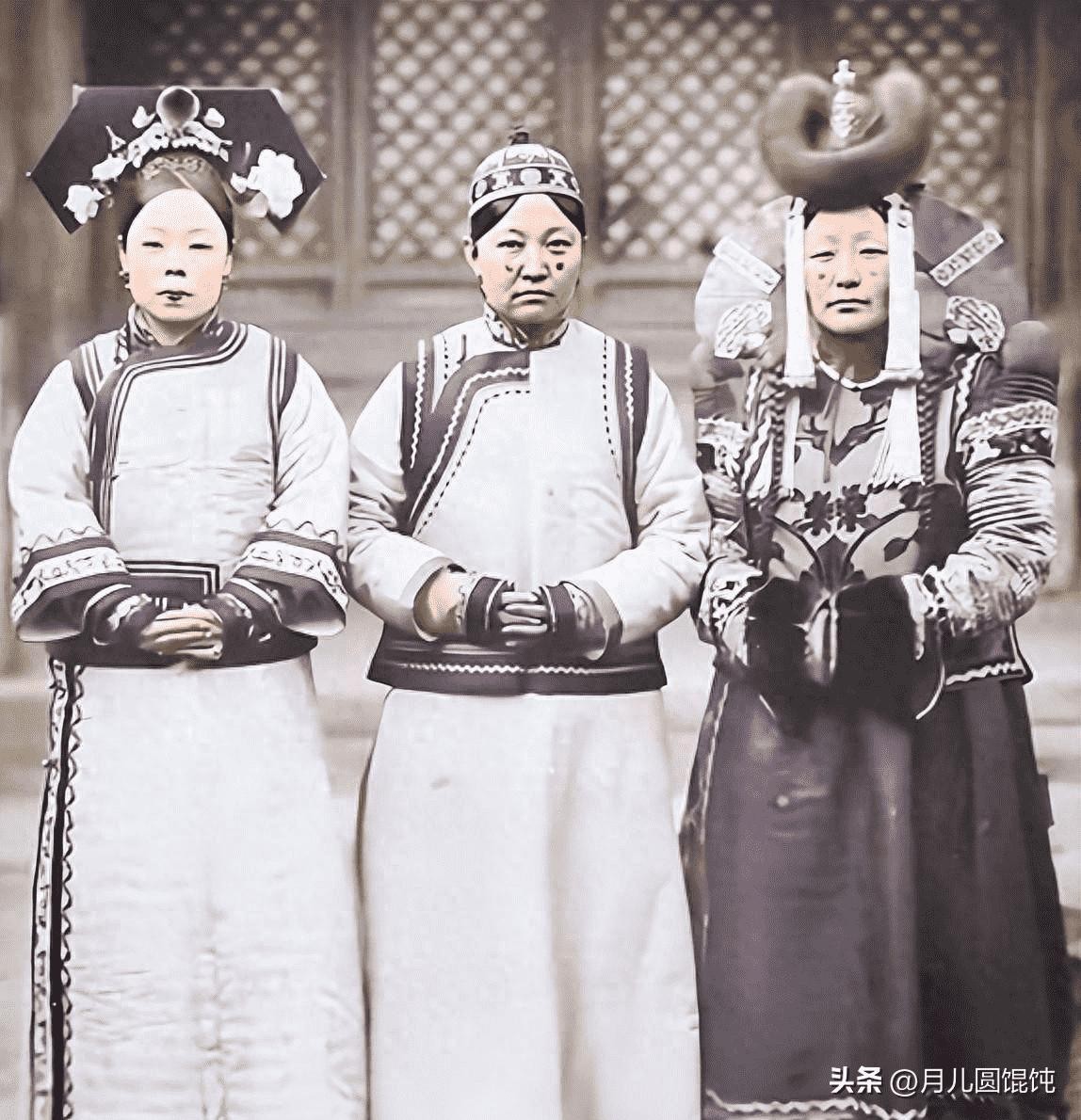 三位满蒙贵妇的合影照,左边是满族女子,头戴大拉翅,另一位戴着瓜皮帽,右边是蒙古女子,戴着牛角头饰,容貌一般却有一股独特的韵味
