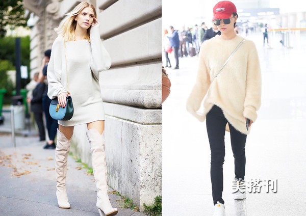 ♦毛衣中长款的毛衣裙,让你省心的穿搭,选搭过膝靴或者黑色紧身裤(上图),气质与休闲的造型选搭,日常选搭短款外套还是长款大衣都可以的,颜色上推荐简约的黑白色调,在配饰上推荐搭配彩色。