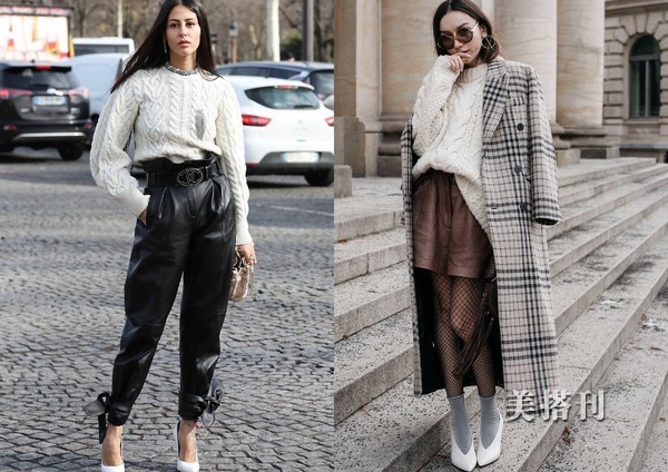 ♦在色调的搭配上,如上图一中简单的穿搭,白色毛衣和黑色纸袋皮裤,裤脚绑带收口,简单都市借鉴装,如果要选择灰色格纹大衣,短裤的颜色以深彩色加上宽松的毛衣,都市丽人穿搭,白色毛衣在选搭鞋子的时候,白色是首选。