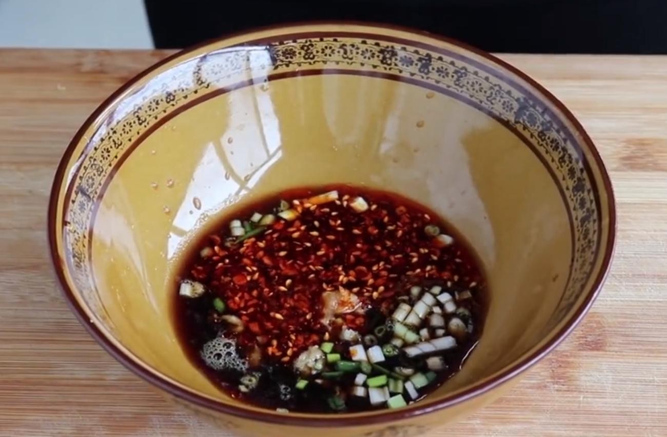 6,准备好一个小碗加入葱花,蒜末,食盐,鸡精,少许糖,少量的生抽,多一点的陈醋,根据自己的口味加入几勺辣椒油